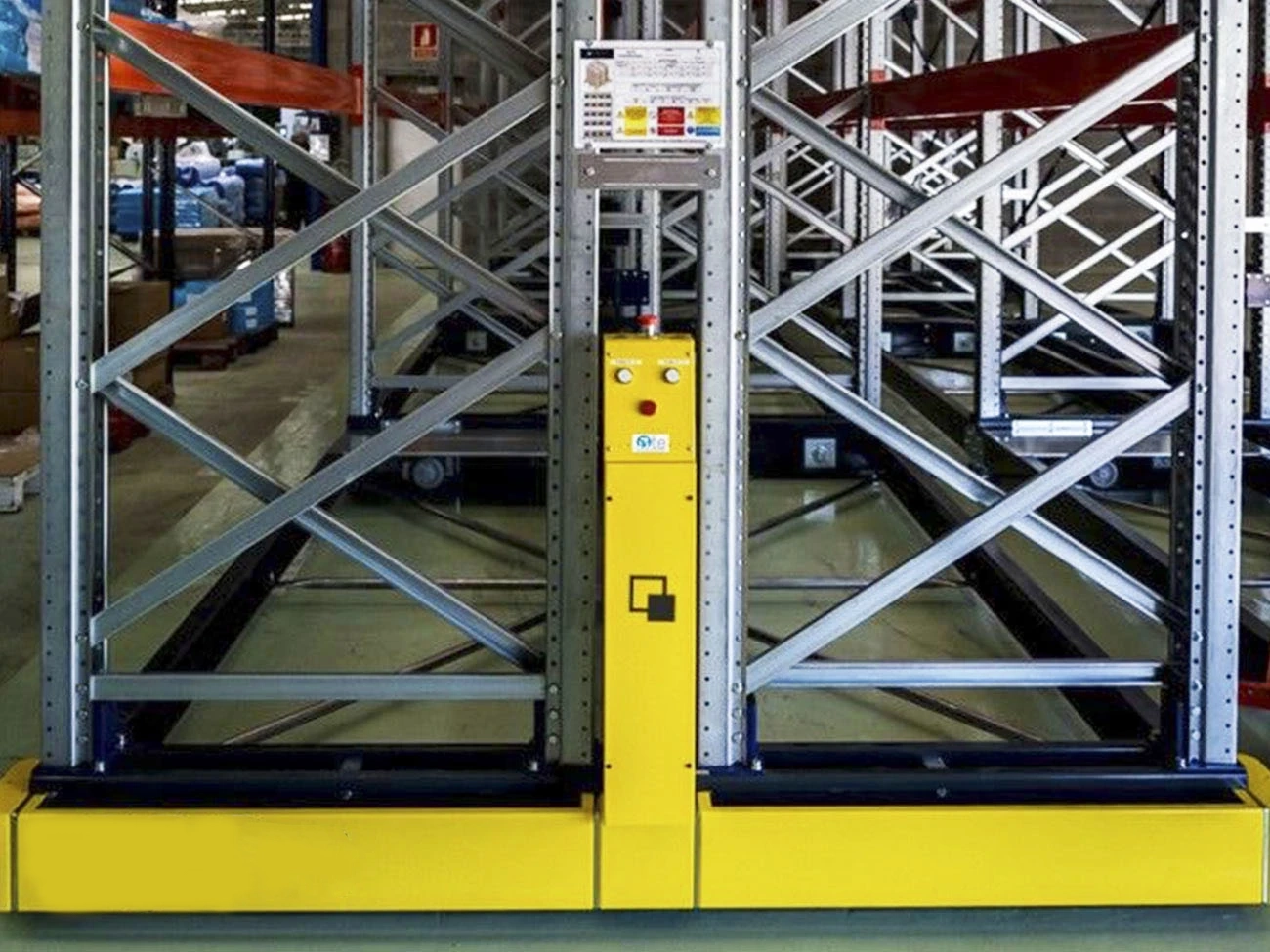 Die Palettenregale sind auf motorisierten, mobilen Fahrgestellen montiert, die sich automatisch bewegen. Sie ermöglichen dem Bediener den Zugang zu genau dem Gang, der benötigt wird, um eine bestimmte Palette zu entnehmen. Dadurch wird der Platz für permanente Gänge erheblich reduziert und die Lagerdichte pro Quadratmeter maximiert..