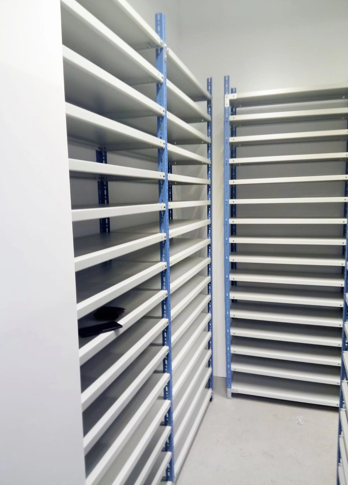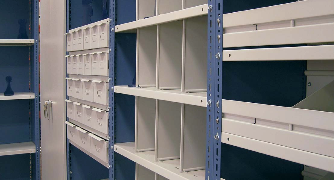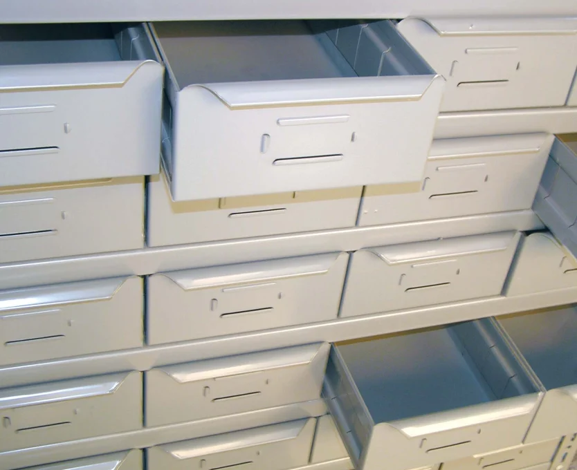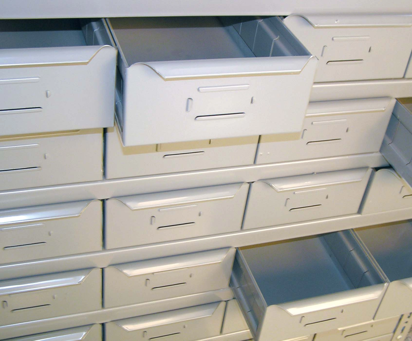 Die Biegungen der EC-Fachböden ermöglichen das Einlegen von Hängemappen ohne Führungen.
