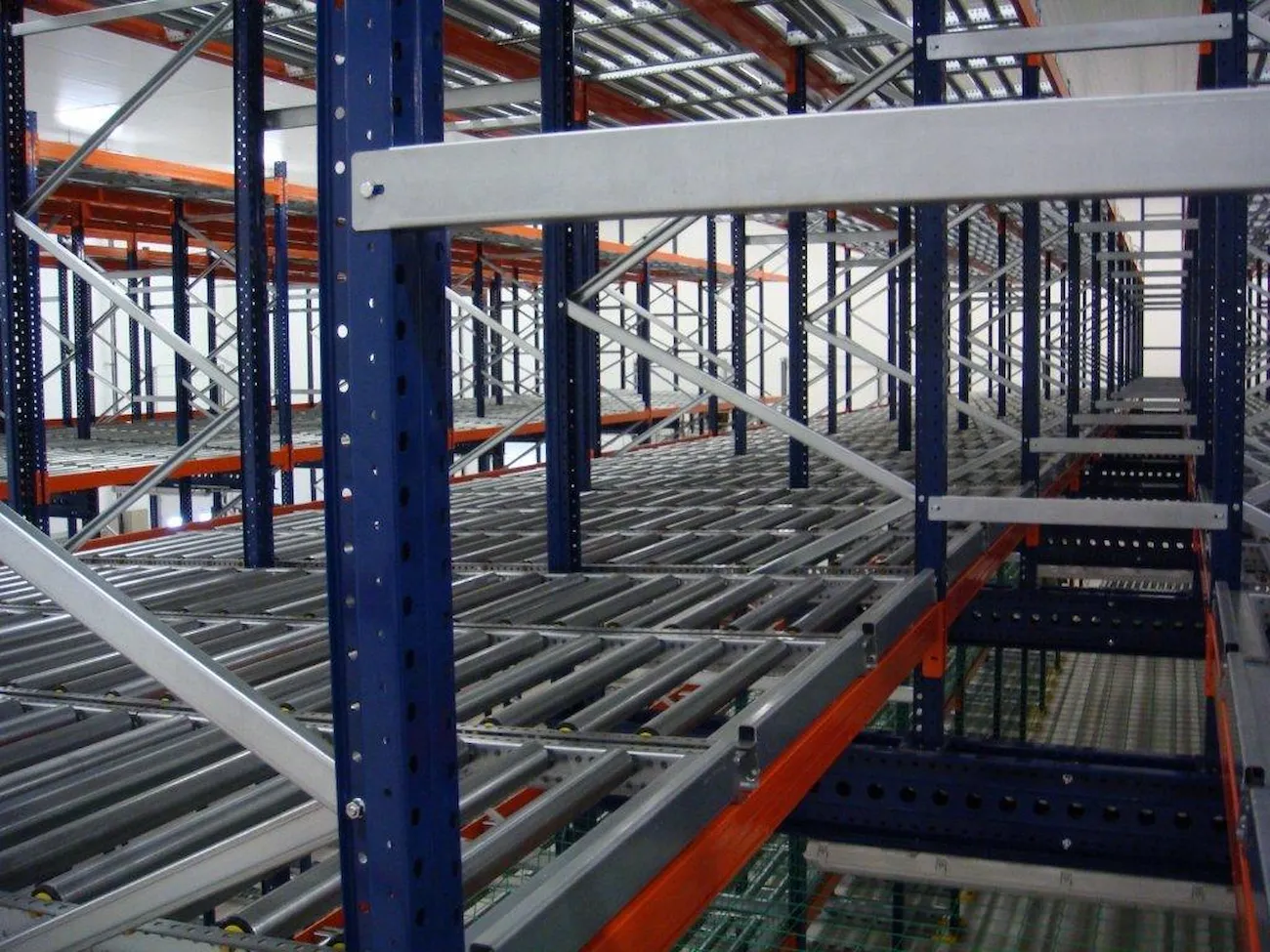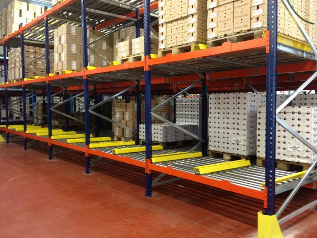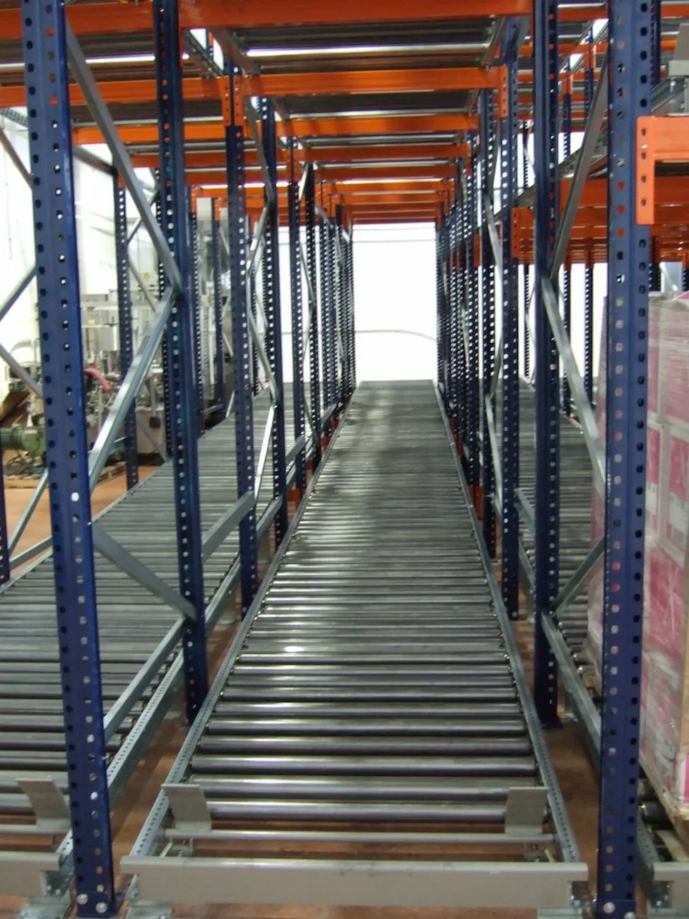 This system features racking with roller tracks set with a slight incline, allowing pallets to glide smoothly by gravity at a controlled speed from the loading point to the unloading end.