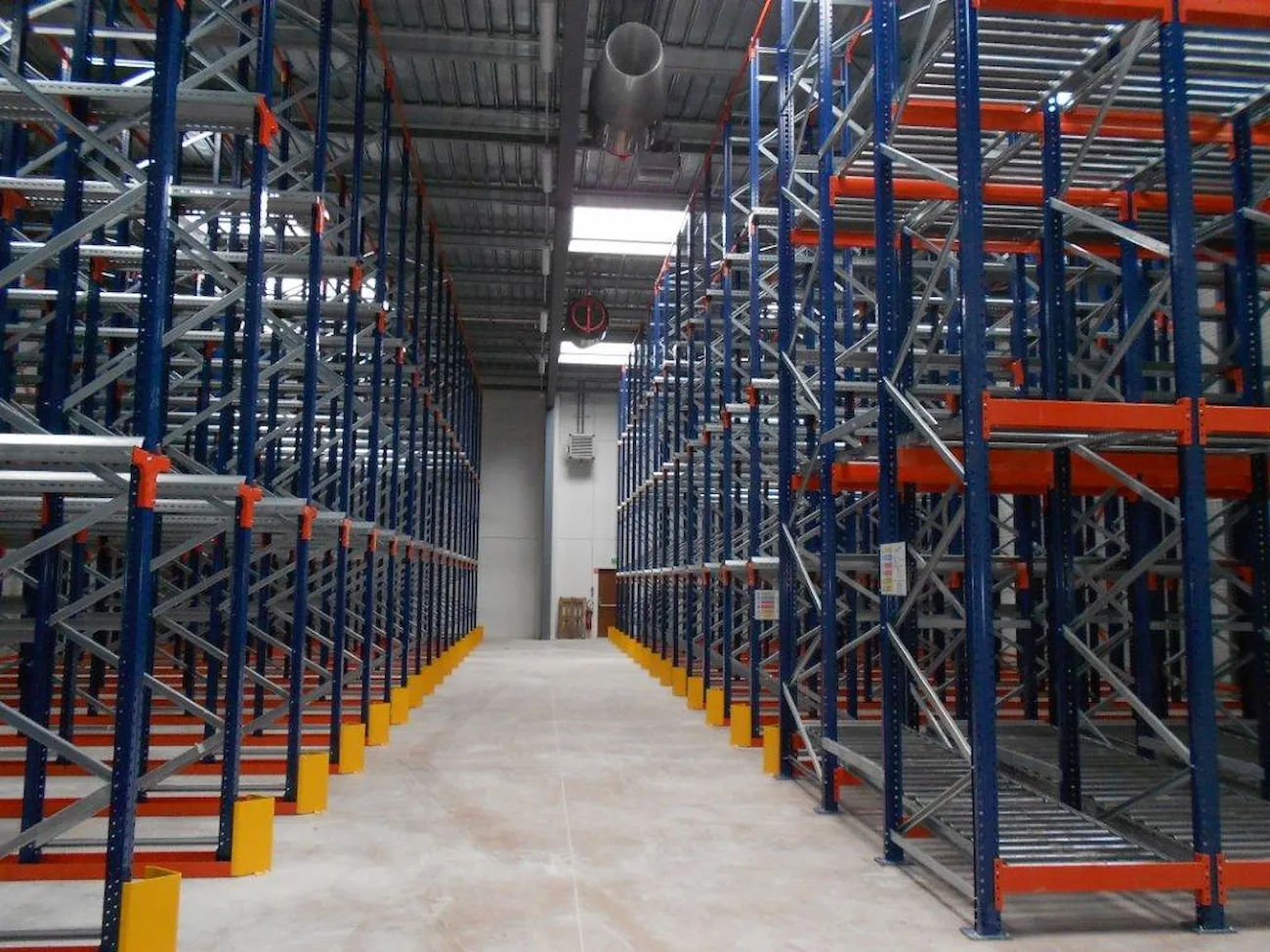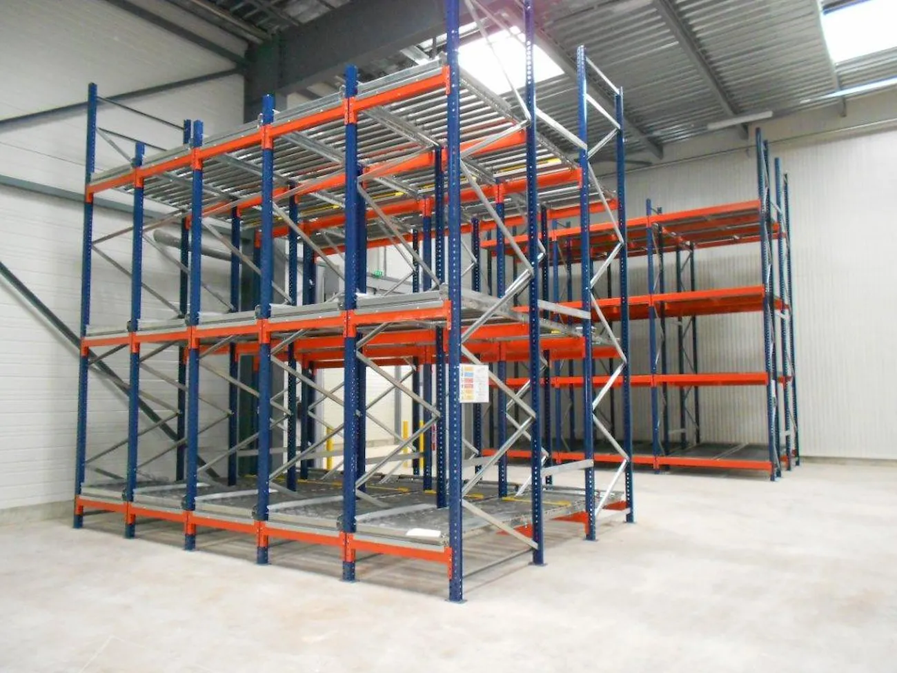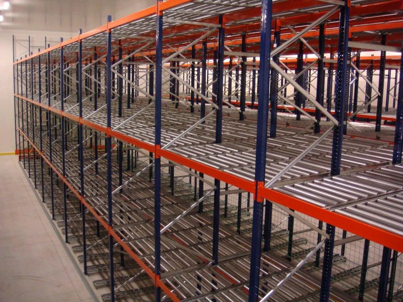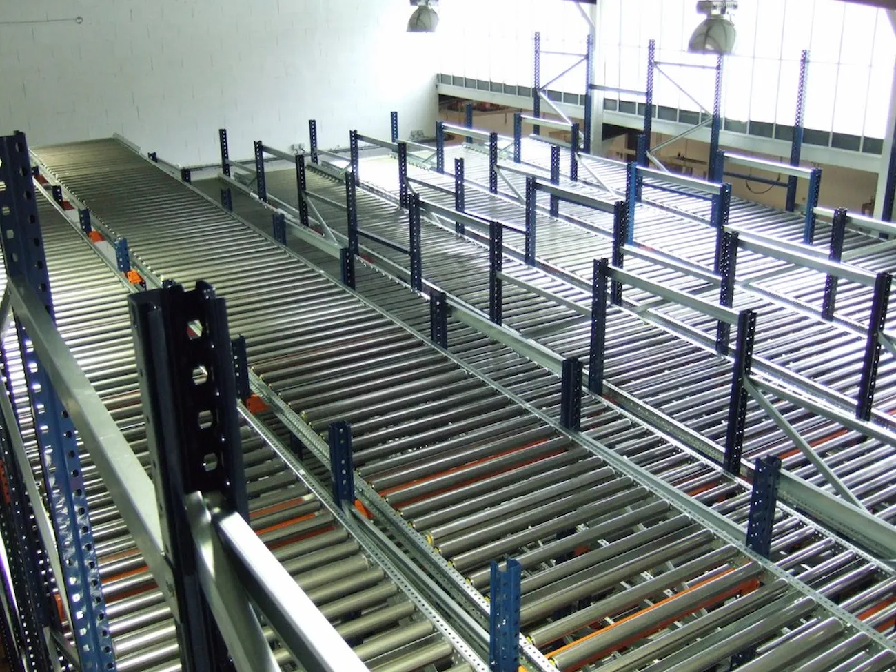 This system features racking with roller tracks set with a slight incline, allowing pallets to glide smoothly by gravity at a controlled speed from the loading point to the unloading end.